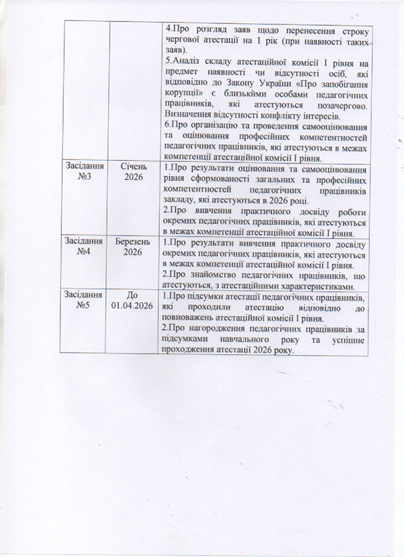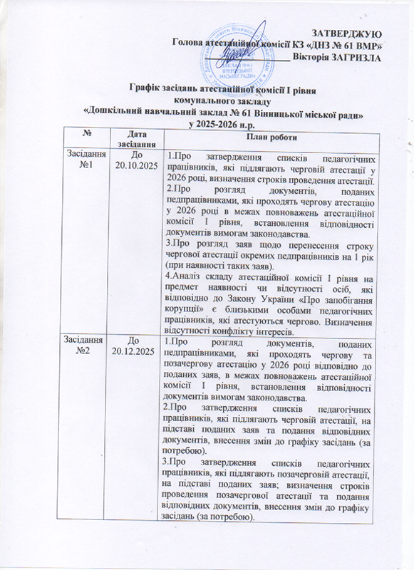 Графік засідань атестаційної комісії КЗ "ДНЗ № 61 ВМР" на 2025-2026 н.р.