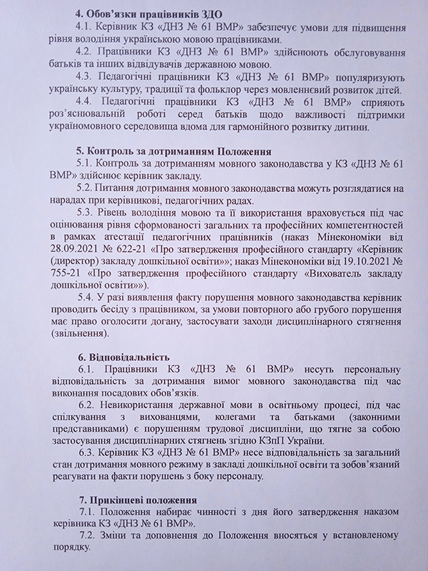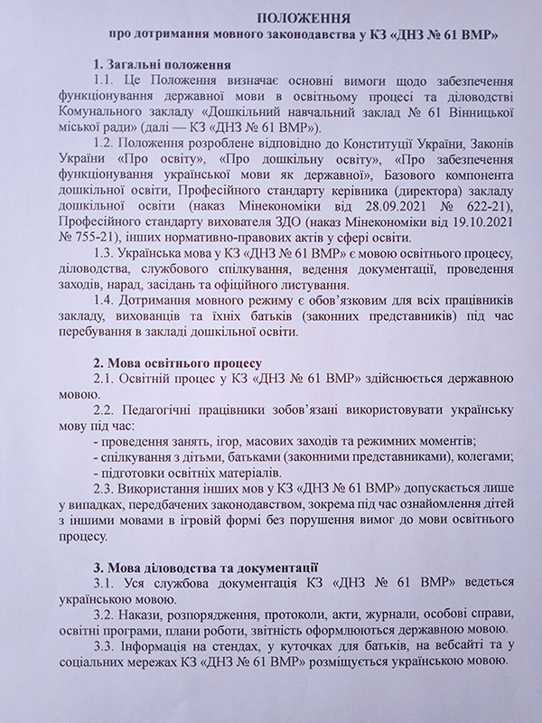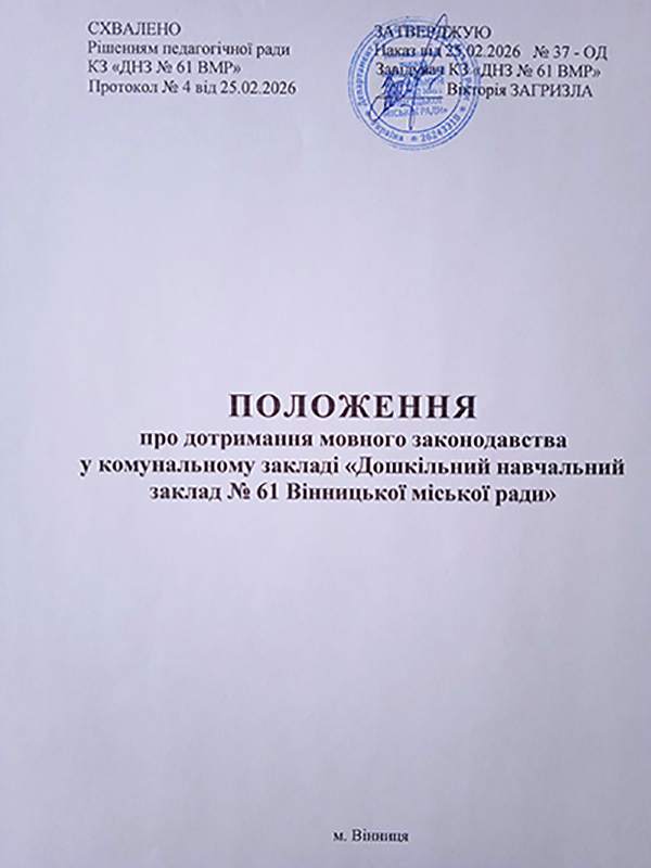 Мовою освітнього процесу в комунальному закладі "Дошкільний навчальний заклад № 61 Вінницької міської ради" є державна українська мова